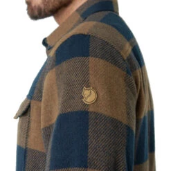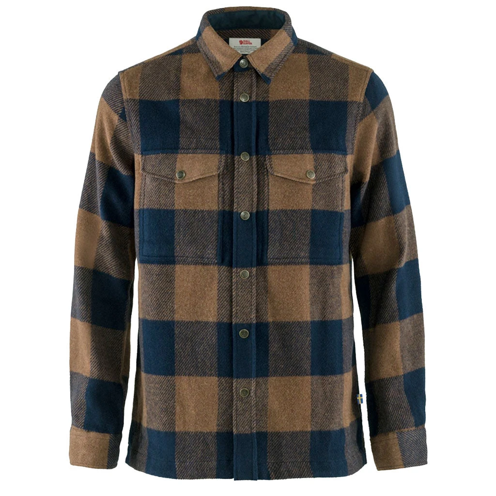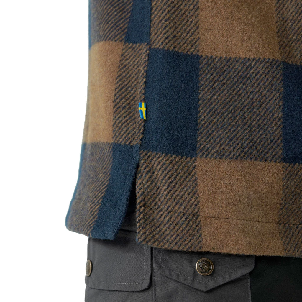 Dette er en flanellskjorte i tykt stoff som er laget i en blanding av akryl, polyester og ull for å gi den slitesterke, varmende og hurtigtørkende egenskaper.