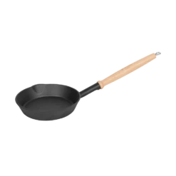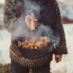 Her lukter det egg og bacon, små pannekaker og fersk ørret som krøller seg i panna. Praktisk støpejernspanne med ekstra langt skaft av tre, til bruk på bål og bålpanne. Liten nok til puttes i tursekken.