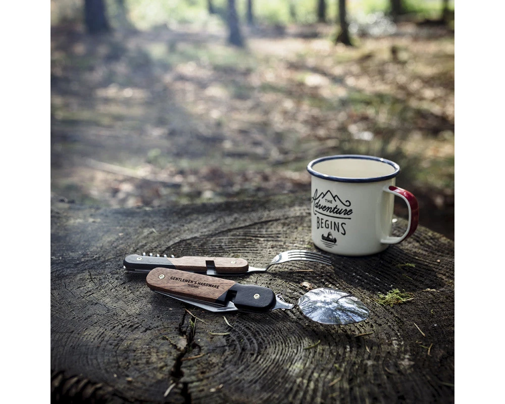 Gentlemen’s Hardware Camping Cutlery Tool er et multifunksjonelt og eksepsjonellt solid bestikksett med en gaffel, kniv, skje, korketrekker, flaskeåpner, boksåpner og en kort kniv.