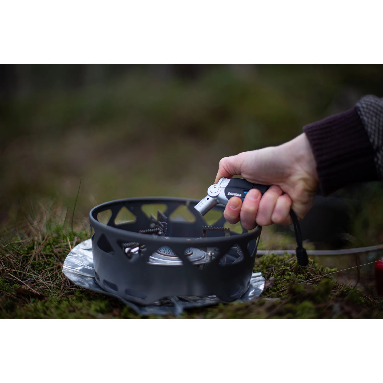 Power Lighter er en fin løsning på tur som gir garantert flamme uansett hvor ille værforholdene er, og gir en spissflamme på 1300°C selv i heftige vindstyrker. Flammen er justerbar via trykkefunksjonen, og brenner i 30 minutter på full tank. Et vindu lar deg monitorere gassnivået fra utsiden, og fylle raskt og enkelt fra åpeningen i bunnen.