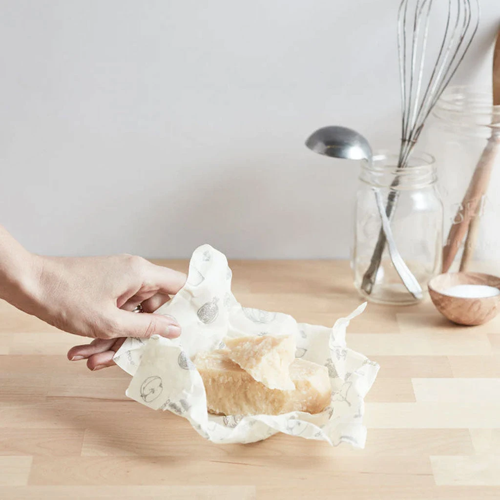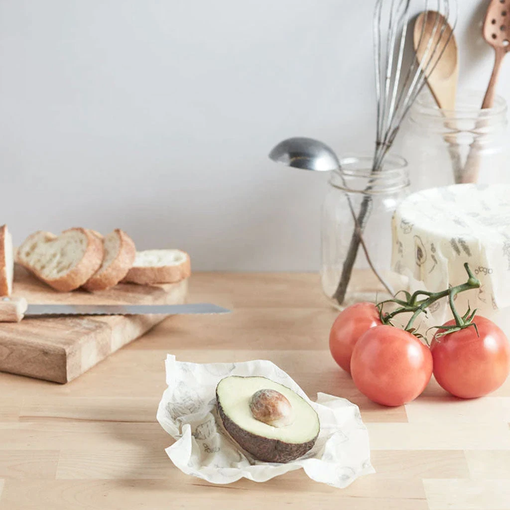 Ingen vet sikkert hvor lang tid det tar for plast å brytes ned i naturen, men forskere anslår mellom 20 og 1000 år. Nå kan du spare både deg selv og naturen for plast ved å pakke maten din i Abeego – praktiske matomslag laget av tynn, økologisk bomull og hamp. Arkene er innsatt med bivoks, harpiks og jojobaolje – alle naturlige konserveringsmidler. Abeego er formbar ved romtemperatur og stivner i kjølskapet, noe som gjør at formen holder seg perfekt til du pakker ut maten igjen. Passer perfekt til oppbevaring av ost, grønnsaker, frukt, brød, osv.